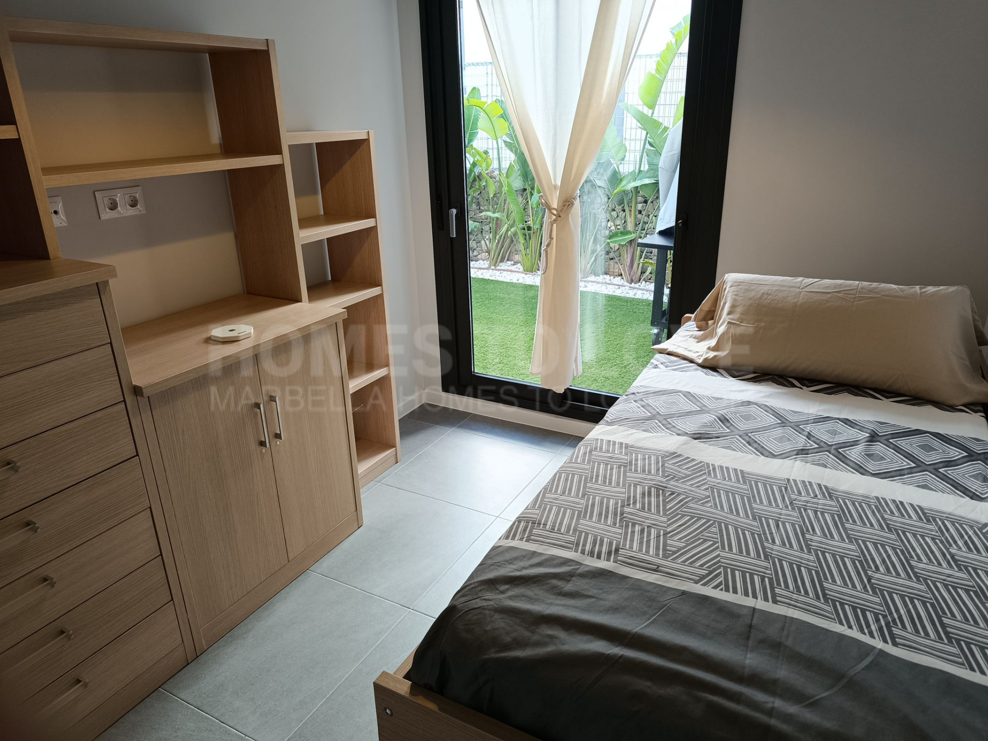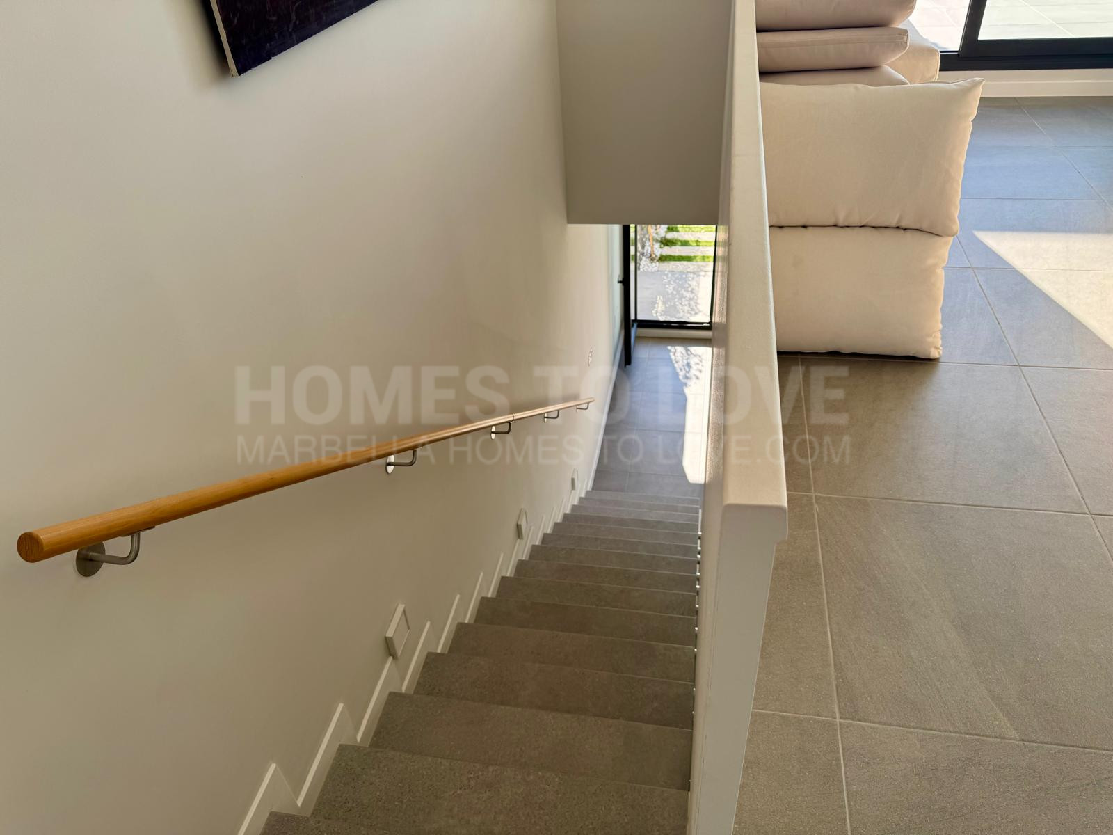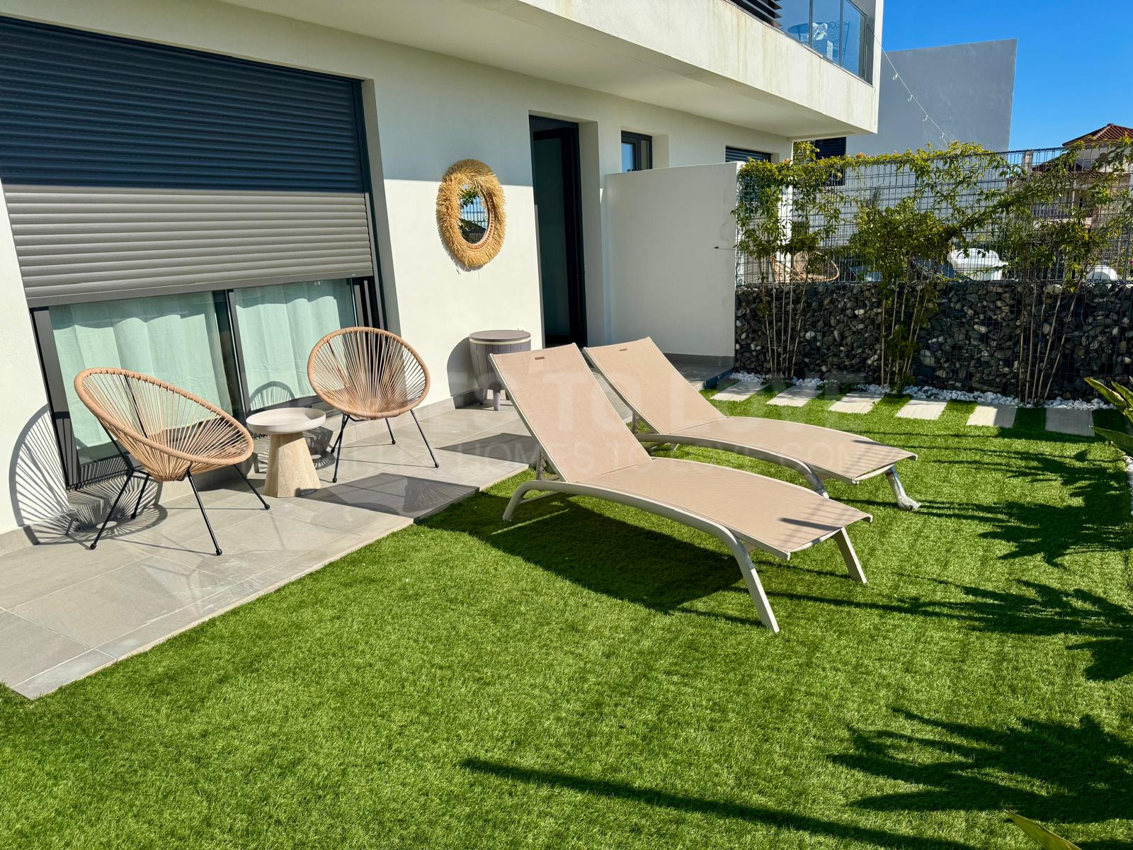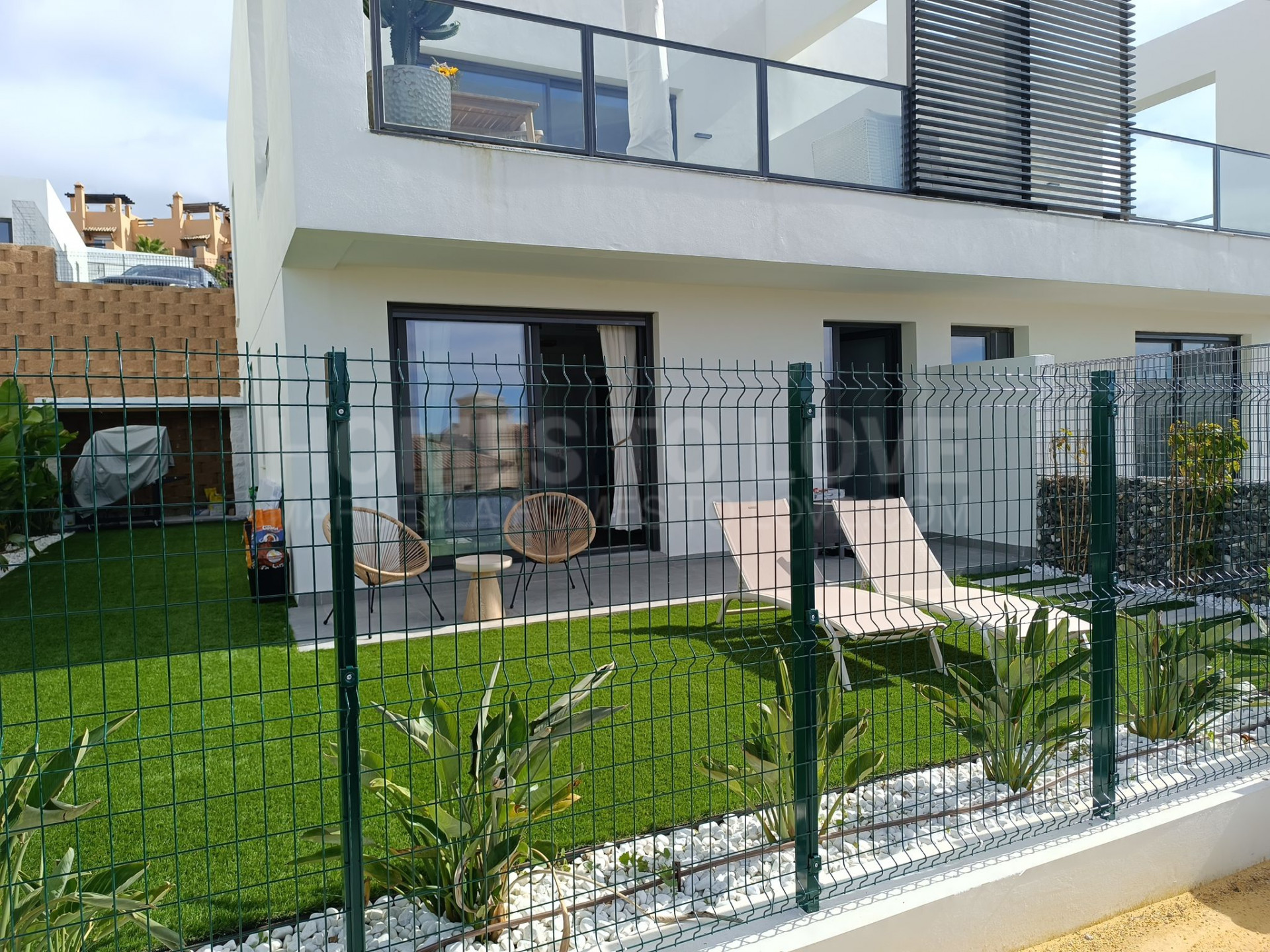 Die untere Ebene ist der Ruhe und Entspannung gewidmet und umfasst drei geräumige Schlafzimmer sowie zwei elegant ausgestattete Badezimmer, darunter ein Hauptschlafzimmer mit eigenem Bad. Jedes Schlafzimmer bietet direkten Zugang zu einem großzügigen, 190 m² großen Privatgarten, wodurch ein harmonisches Zusammenspiel von Innen- und Außenbereich entsteht und die Räume von natürlichem Licht durchflutet werden. Vom Hauptschlafzimmer aus genießt man sogar einen teilweisen Meerblick, was den luxuriösen Charakter zusätzlich unterstreicht.