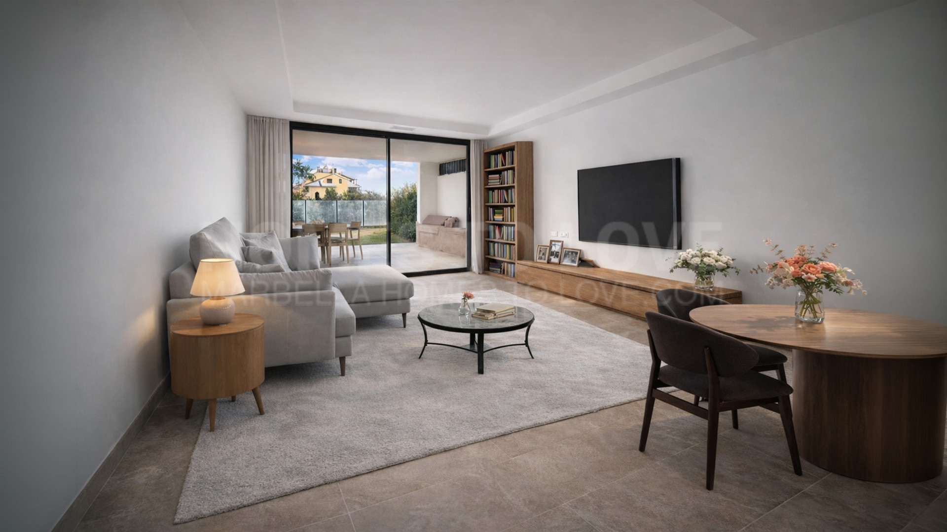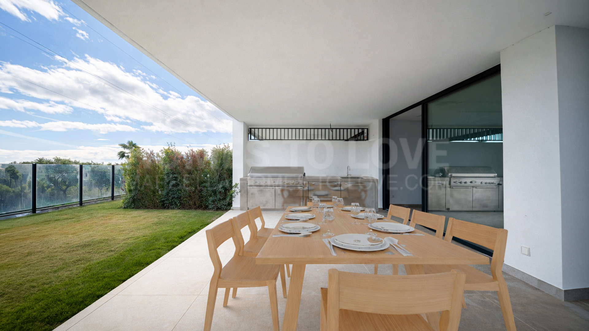 Die Wohnung verfügt über einen hellen, offenen Wohnbereich, der nahtlos auf eine große, überdachte Terrasse mit Außenküche übergeht und so einen idealen Innen-Außen-Lebensstil schafft. Der Eckgarten bietet Privatsphäre und zusätzlichen Außenraum – perfekt zum Entspannen oder für gesellige Stunden.