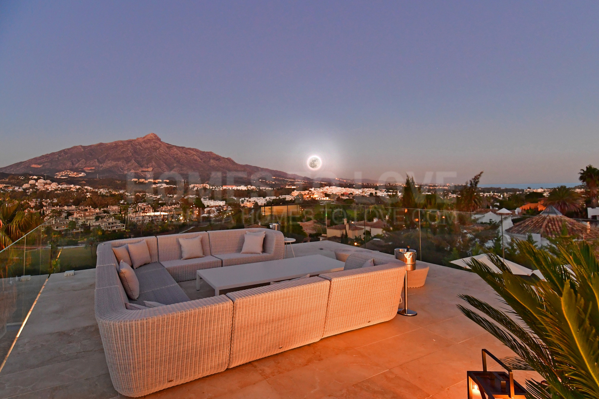 Al entrar en esta extraordinaria villa, la arquitectura moderna se funde armoniosamente con la vista panorámica sobre la montaña de La Concha y el campo de golf de Las Brisas.