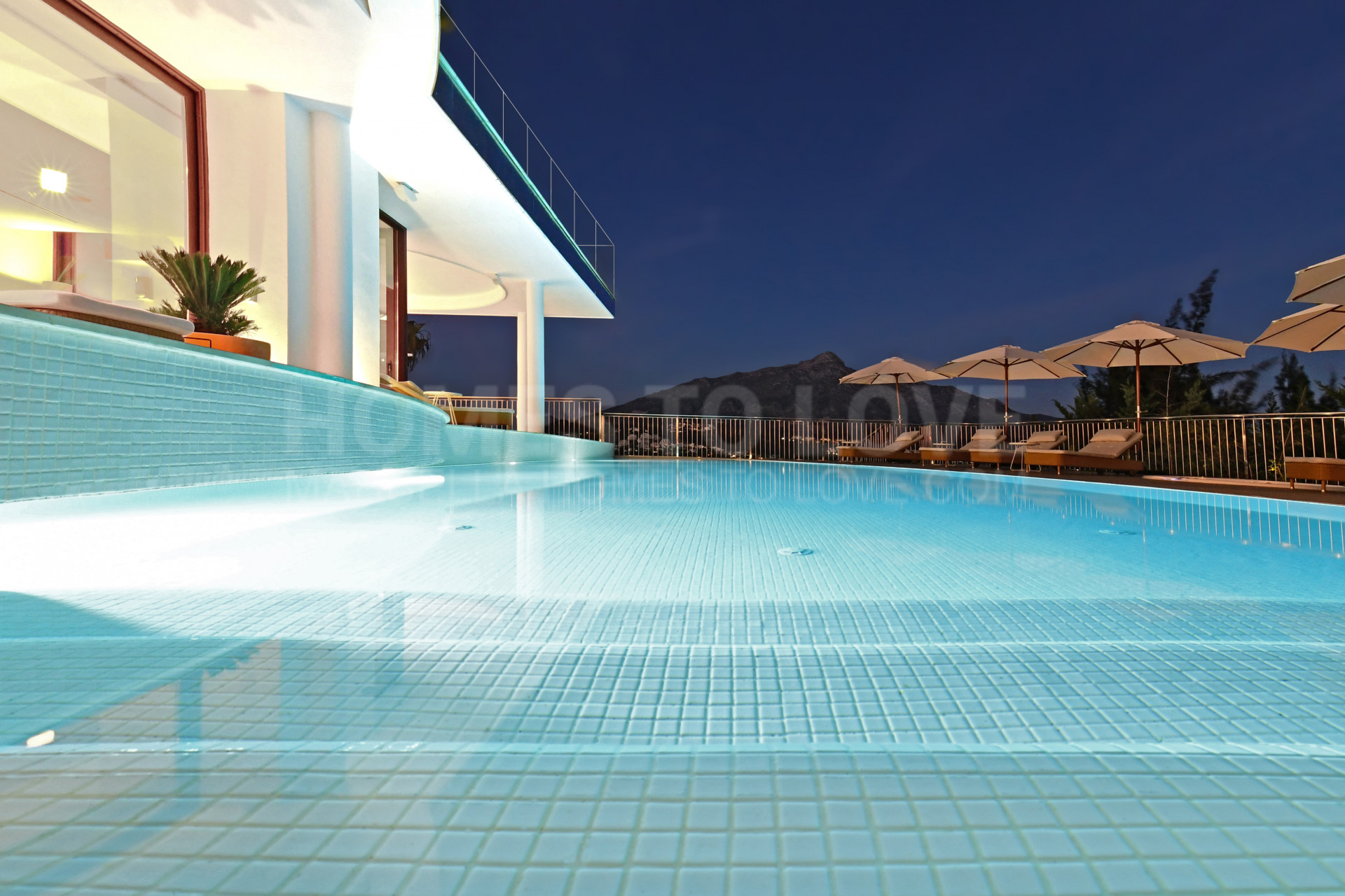 En el exterior cuenta con una amplia terraza con palmeras, una gran piscina infinita climatizada y jacuzzi. La excelente zona de barbacoa es ideal para pasar el tiempo libre y cenar bajo las estrellas, mientras que el bar parcialmente cubierto y los asientos del salón en la terraza del segundo nivel pueden elevar el ambiente de calma a una gran fiesta con total privacidad y vistas hacia las montañas y el mar. Se trata de una impresionante vivienda de lujo.
