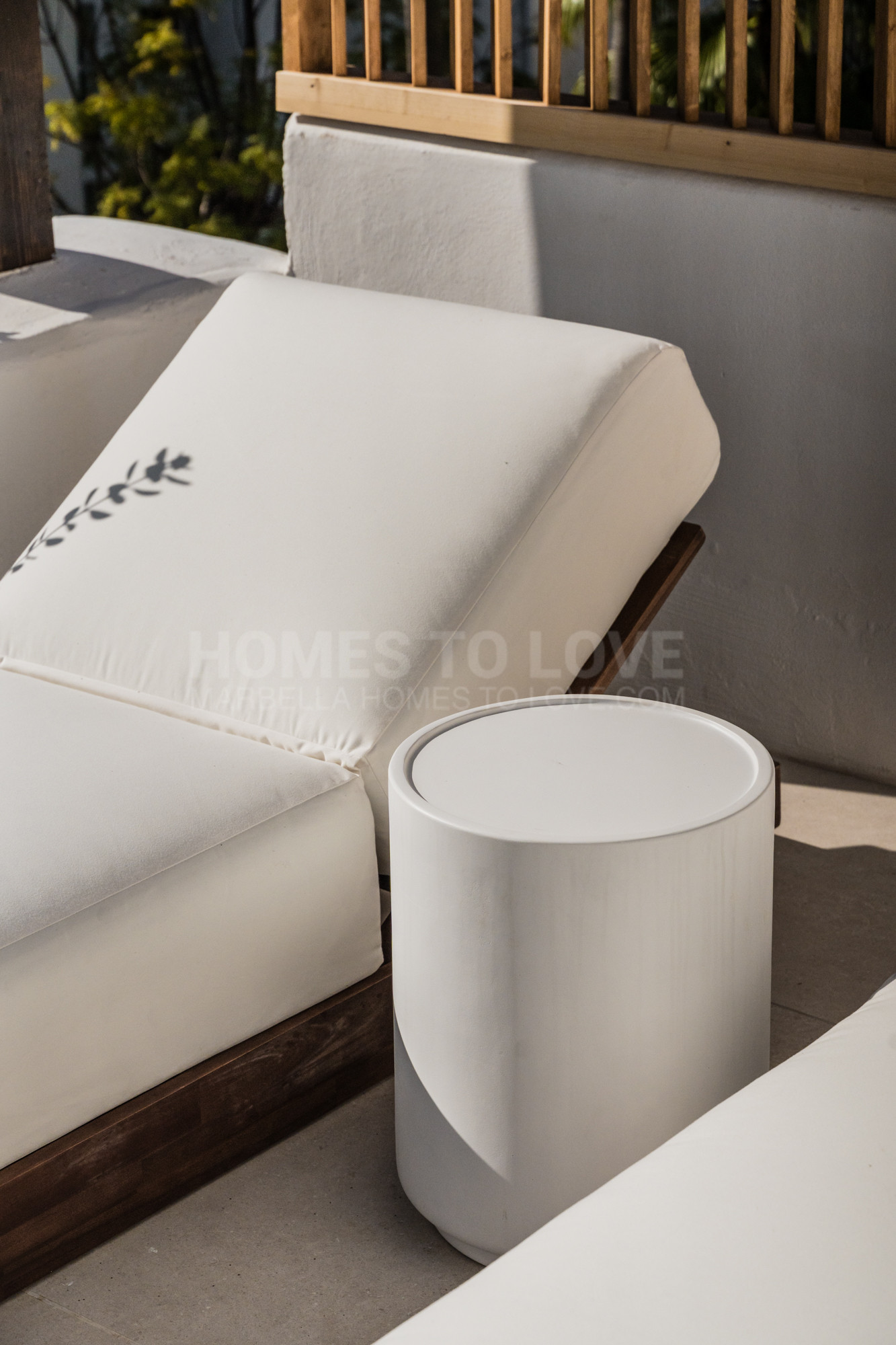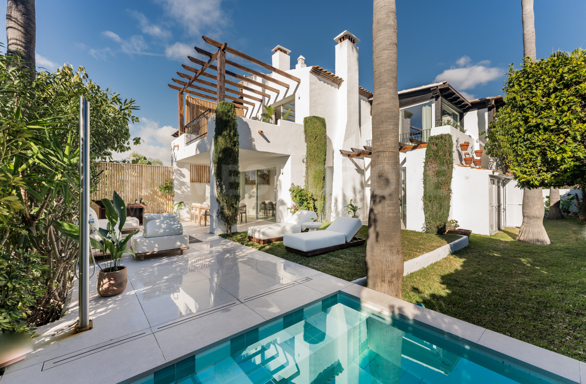 Situada en una parcela de esquina privilegiada, la villa está rodeada de palmeras maduras, vegetación mediterránea, y cuenta con una piscina tipo plunge pool privada, perfecta para refrescarse y relajarse.