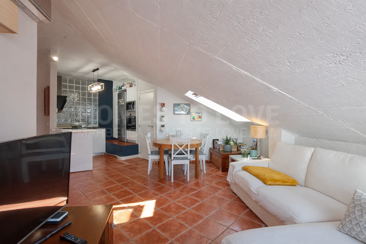 Ubicado en una quinta planta de un edificio en muy buen estado en el centro de Marbella, este ático abuhardillado de 104 m² destaca por su carácter, luminosidad y vistas panorámicas despejadas a la montaña y al casco urbano.