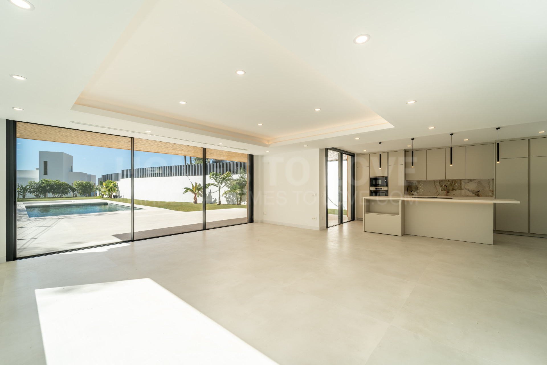 Salón y comedor de planta abierta con ventanales de suelo a techo que aportan luz natural