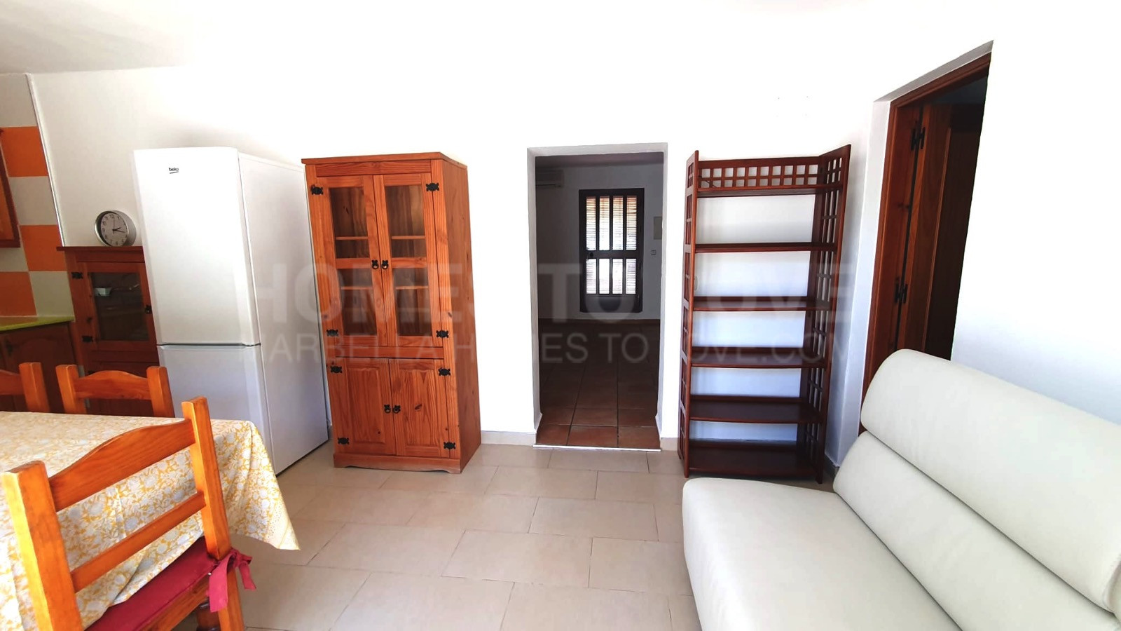 Luminoso salón-comedor a planta abierta, que fluye hacia una cocina amueblada con electrodomésticos esenciales: nevera, lavadora, vitrocerámica de gas y termo de agua caliente – lista para disfrutar de inmediato.