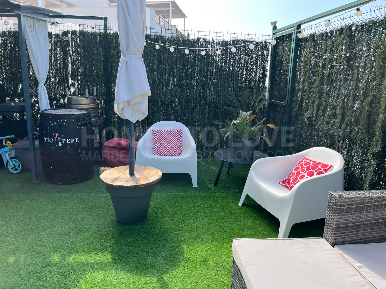 Les extérieurs sont tout aussi remarquables avec un jardin privé, une terrasse couverte, une terrasse non couverte, un balcon et un espace barbecue, parfaits pour profiter du climat méditerranéen et des vues panoramiques sur la montagne, le golf et la mer partielle. Le bien bénéficie également d’un parking inclus dans un garage commun, et l’ameublement est proposé en option.