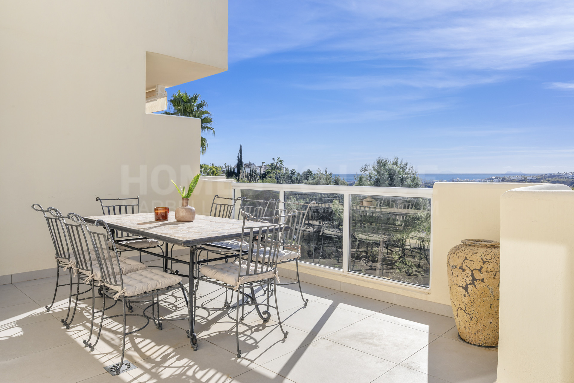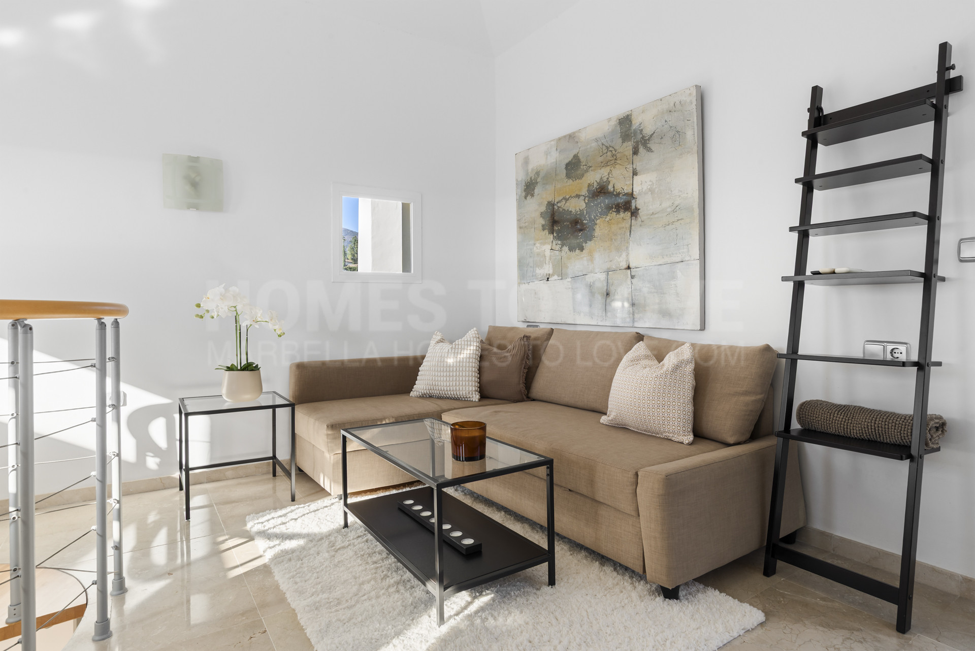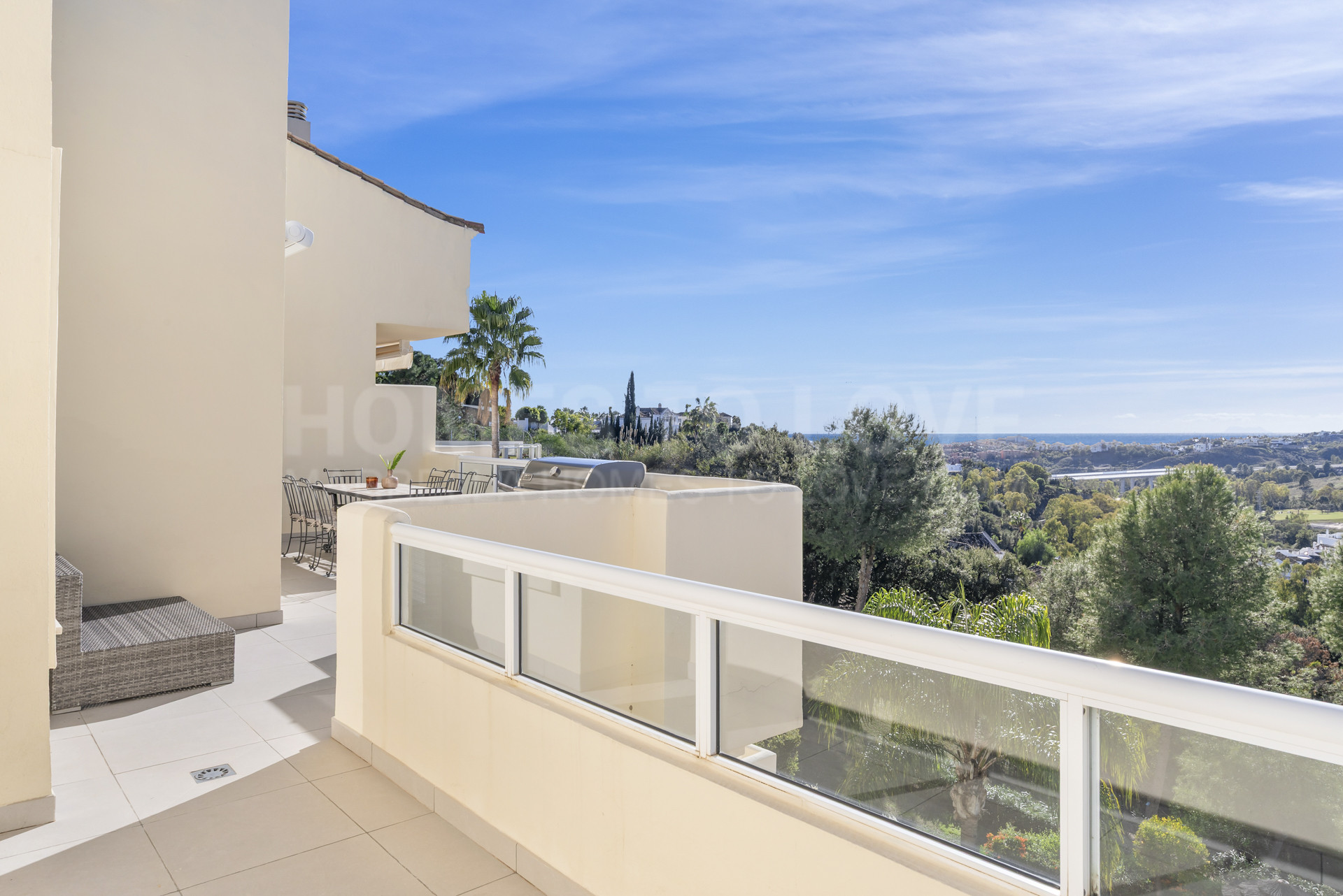 The generous terrace is one of the true highlights of the apartment, designed for outdoor living and entertaining, complete with a dining area and high-quality barbecue, ideal for enjoying warm evenings and panoramic views. Inside, the living areas are tastefully furnished in soft neutral tones, creating a welcoming atmosphere with a seamless connection to the outdoor spaces. The upper level lounge offers a calm and private setting, perfect for unwinding, while large windows and terrace access enhance the airy feel of the home.
