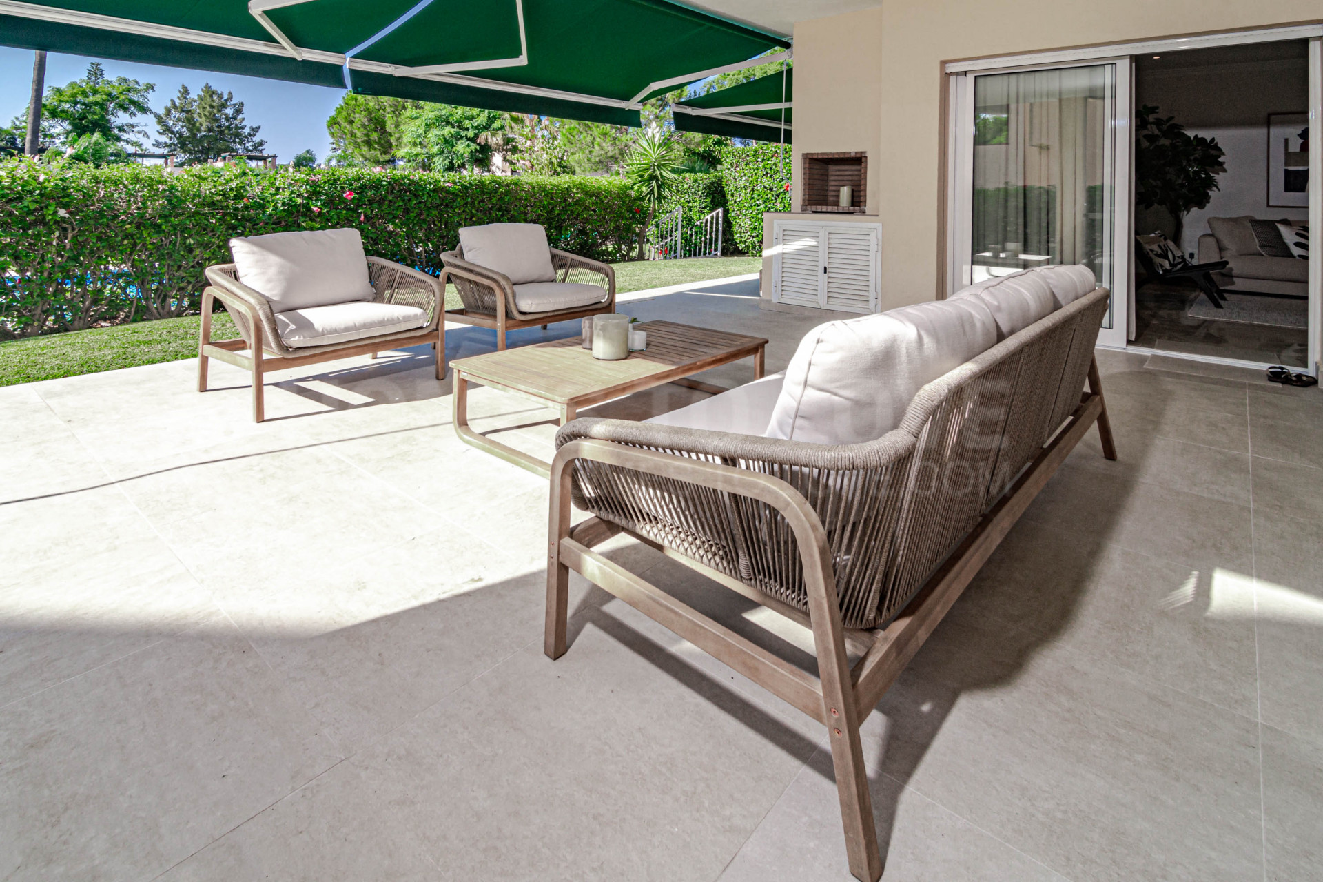 The spacious master bedroom comes with en-suite bathroom and generous wardrobe space, while the other two bedrooms share a bathroom. Large sliding doors open to a partly covered terrace and a private garden, ideal for outdoor dining, BBQs and relaxing in the sun.