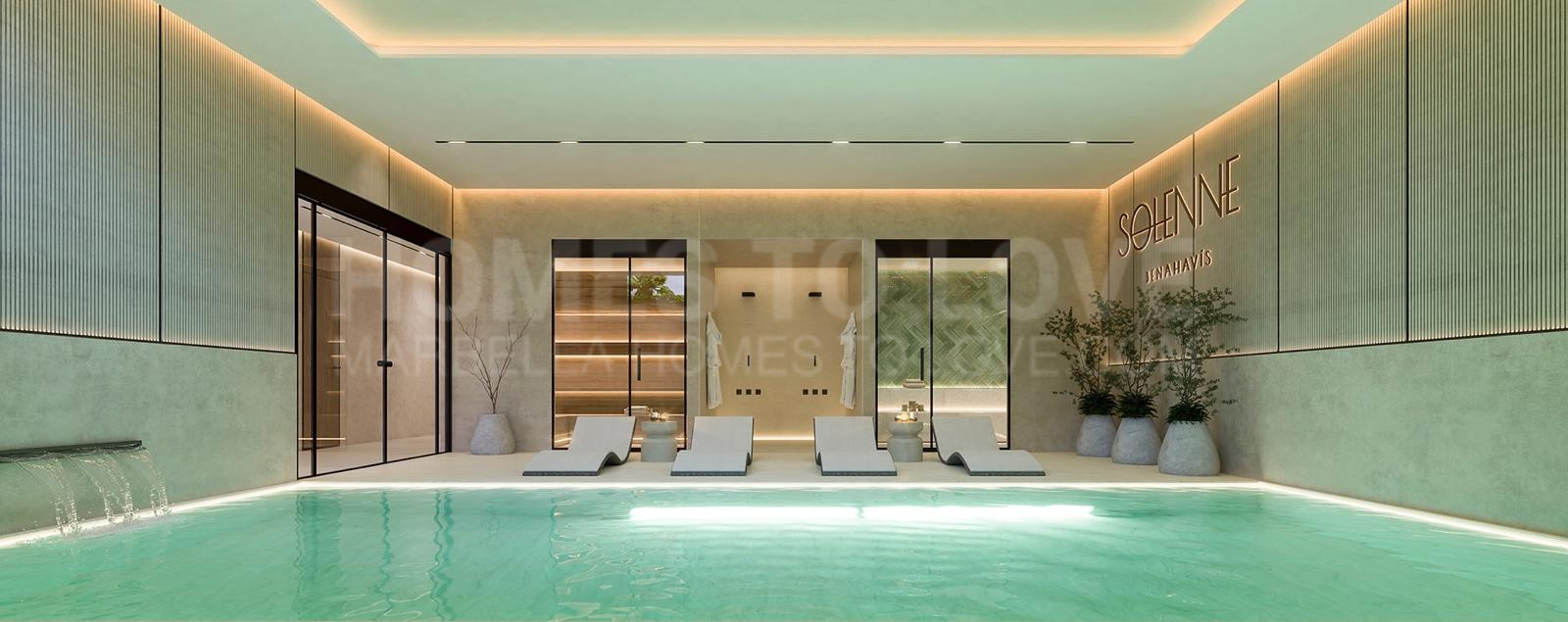 An exclusive development in the heart of the Golden Triangle of Marbella, Benahavís and Estepona. Elevated above the coastline, it offers breathtaking panoramic views of the Mediterranean and surrounding hills. The project features 21 contemporary 2 and 3 bedroom residences with generous interiors (95–186 m²) and expansive terraces. Selected ground-floor units and penthouses include private pools, while residents also enjoy a stylish communal pool, heated indoor pool, fully equipped gym and private golf simulator.