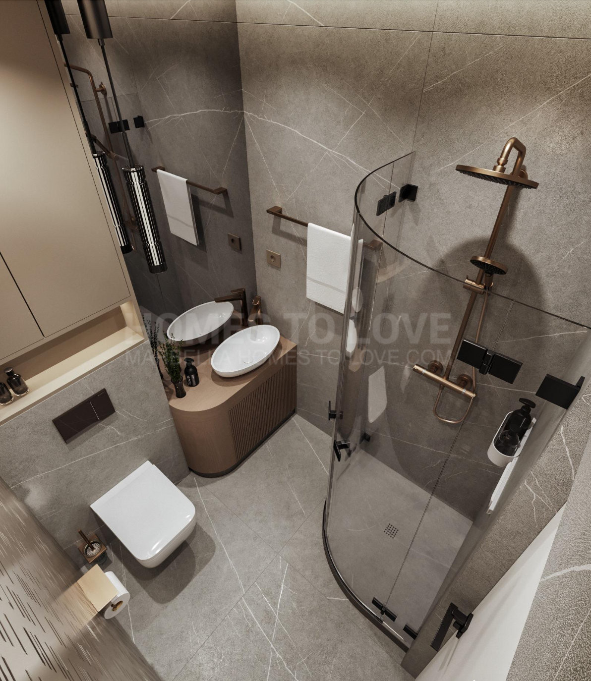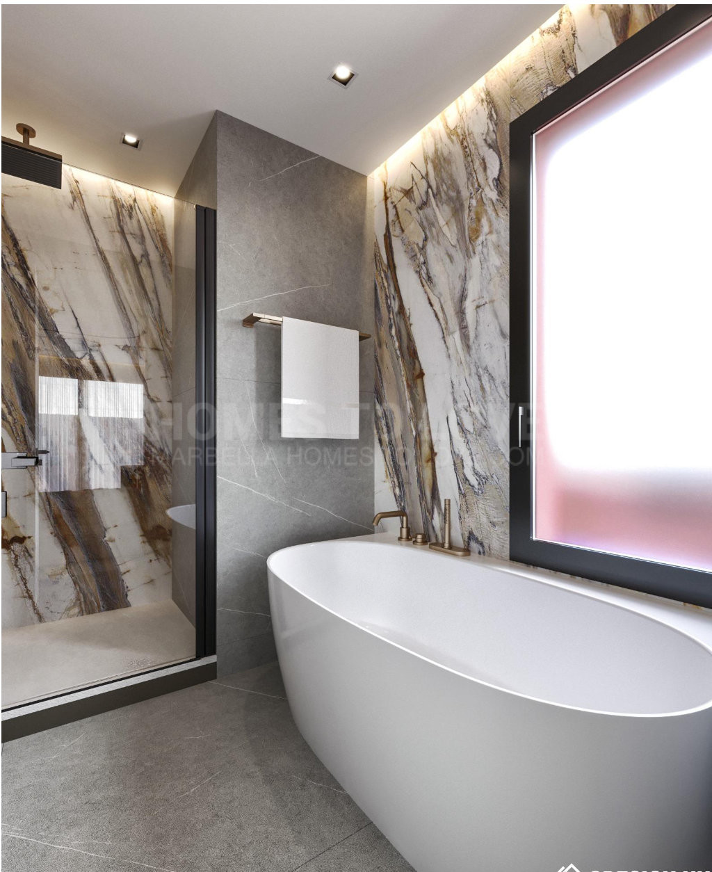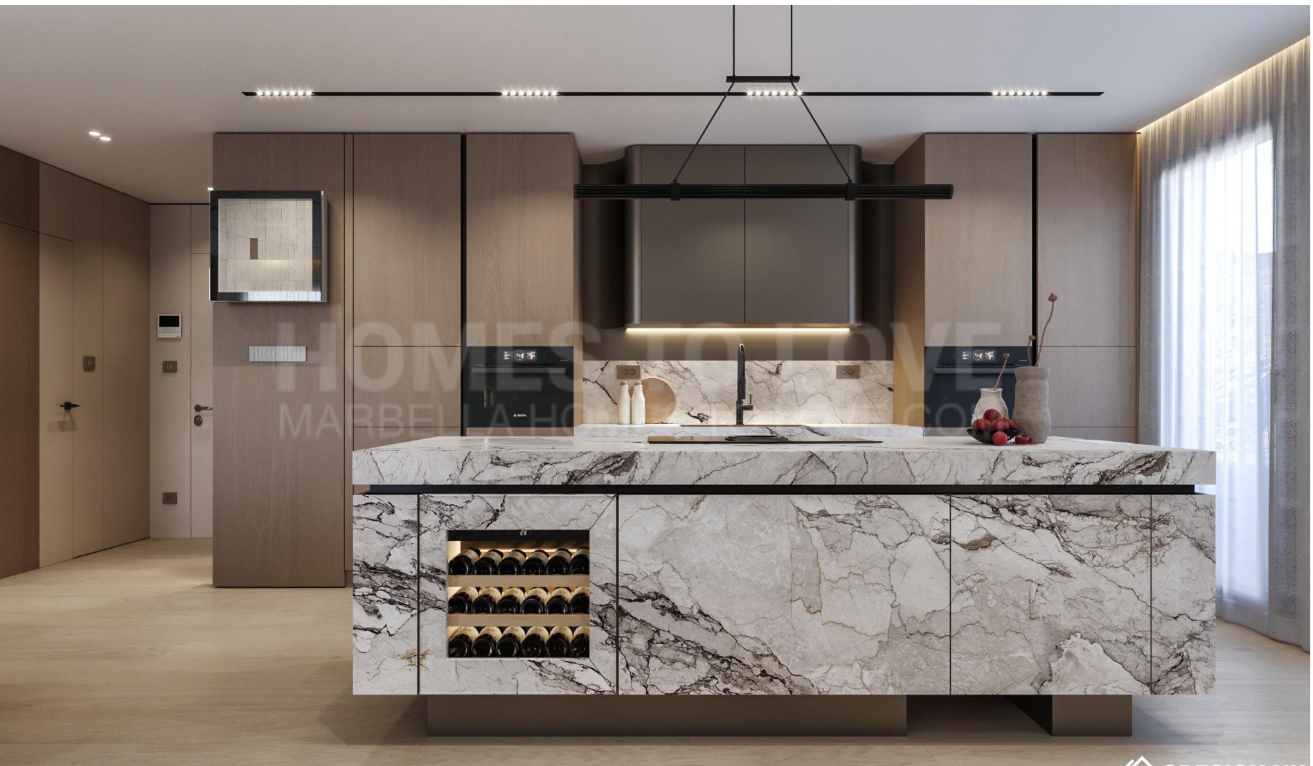 Inside, the 70 m² open-plan living, dining, and kitchen area welcomes abundant natural light, creating an atmosphere of spacious elegance. The home includes three serene bedrooms and three beautifully appointed bathrooms, with the master suite offering a designer freestanding bathtub and wall-mounted rainfall shower. Every detail reflects craftsmanship and harmony: Arklam stone countertops, a statement kitchen island, Miele premium appliances, and a built-in wine cooler complement Austrian-made furniture boards and tailor-made storage solutions. Warm Belgian flooring and Hansgrohe brushed bronze fittings add understated sophistication, while motorised curtain rails and shutters bring effortless comfort.