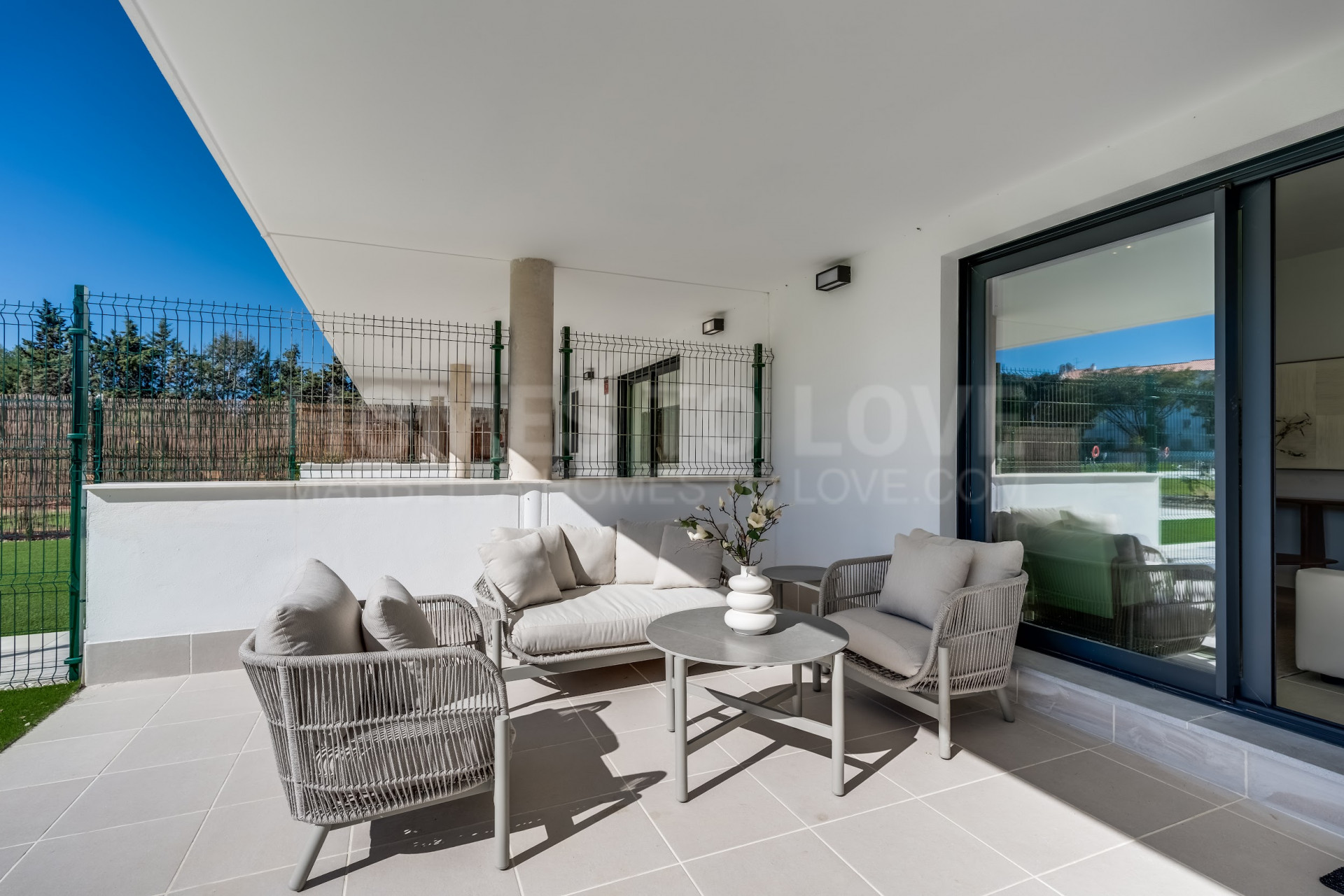 The apartment features two beautifully designed bedrooms, including a serene master suite with its own en-suite bathroom, along with a second contemporary bathroom. The bright open-plan living area flows seamlessly onto a spacious 40m² terrace and an 80m² private garden, creating an outstanding 120m² of outdoor living space perfect for relaxing, entertaining, and enjoying the Mediterranean climate. A modern, fully equipped kitchen completes the interior, offering both functionality and elegant design.