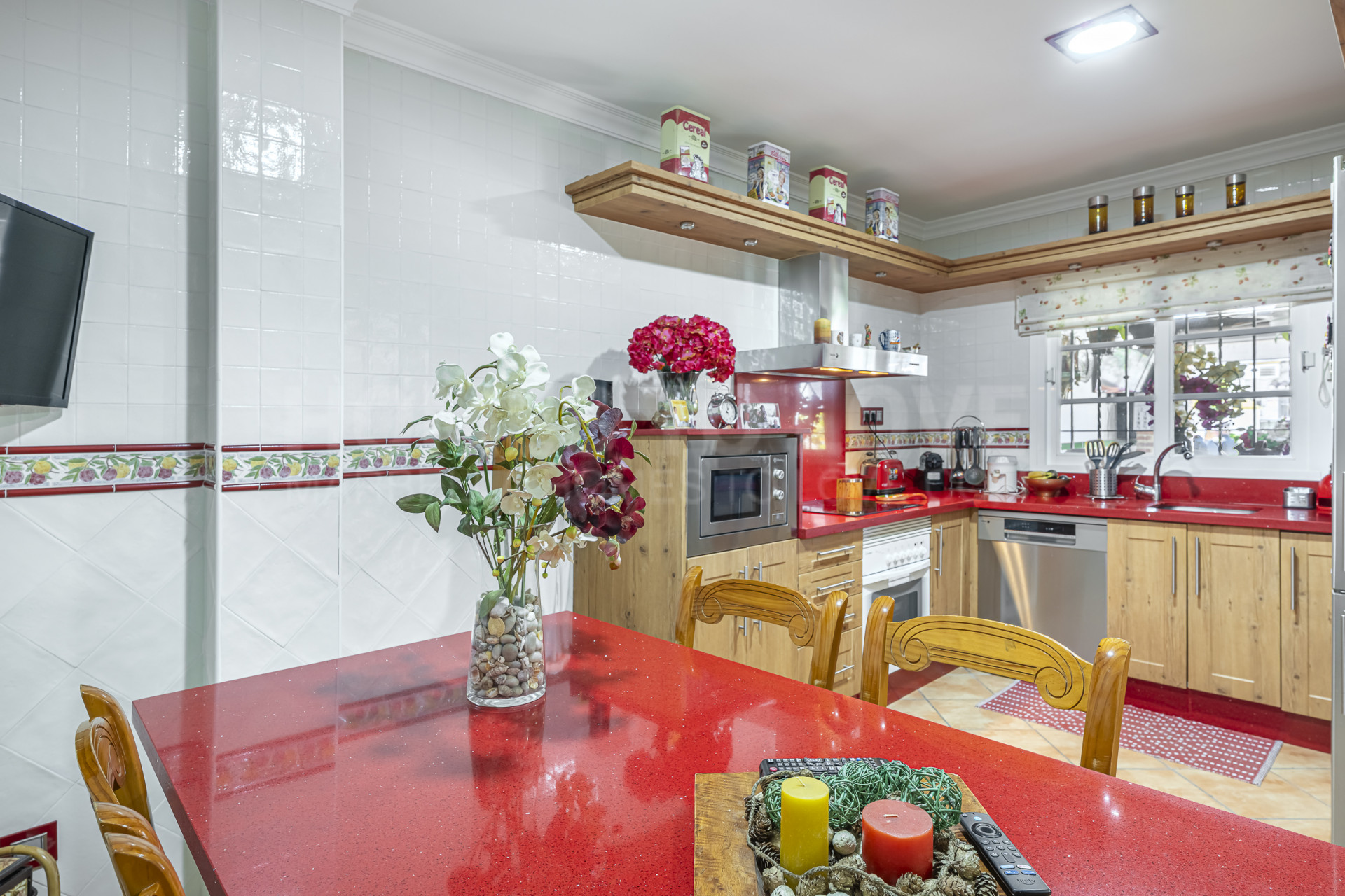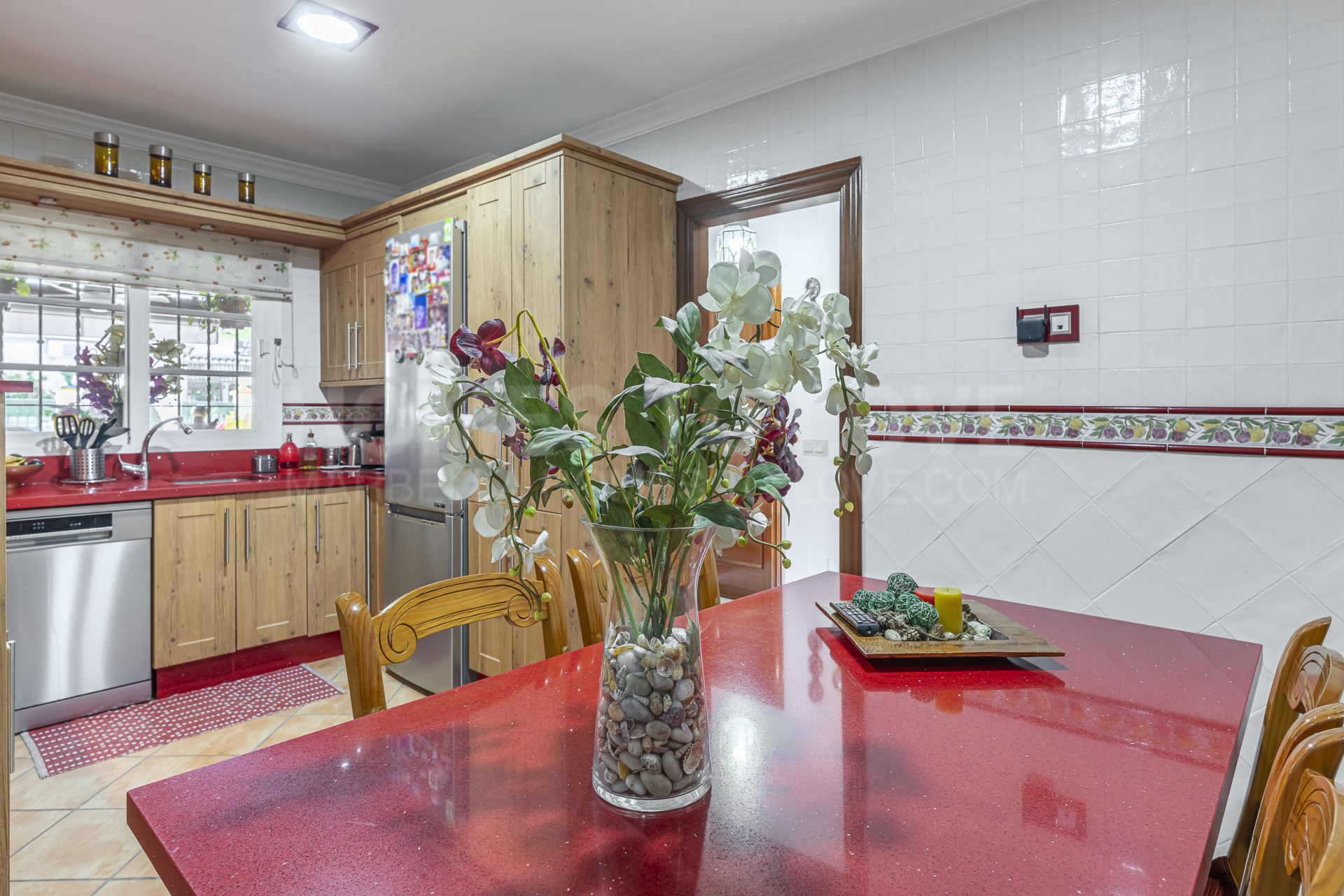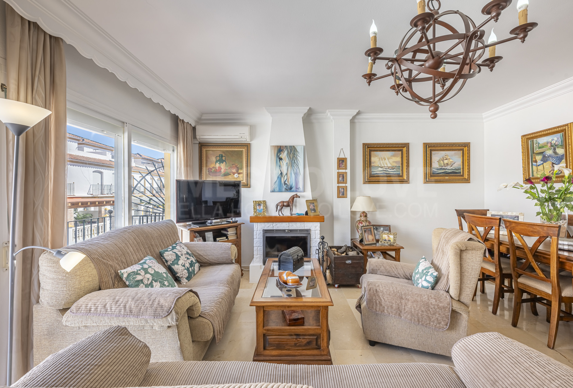 The property is thoughtfully distributed, featuring three good-sized bedrooms, two full bathrooms, one of them en suite, and an additional guest toilet. The main living room is warm and inviting, with a fireplace and plenty of natural light, as well as direct access to a pleasant porch, perfect for everyday use. One of its standout features is the large open terrace, ideal for enjoying the Mediterranean climate all year round. The home also includes a separate dining area and a fully equipped kitchen designed for practicality and comfort.