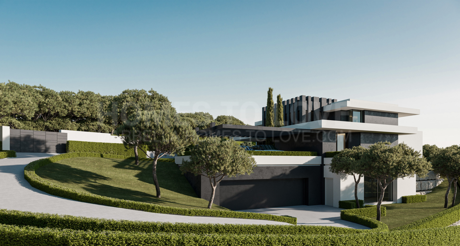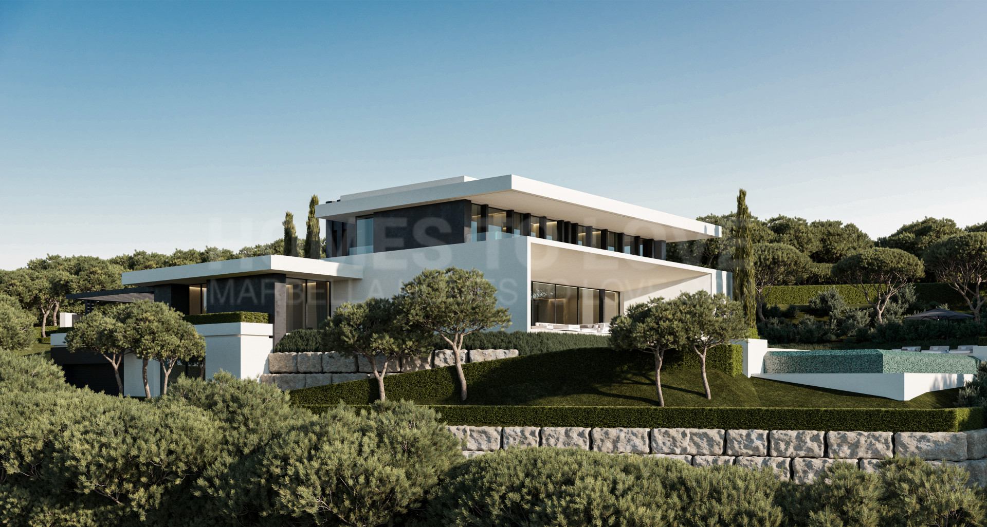Spanning three levels, Villa Forest Edge has a total built area of 1.084 m² and is situated on a spacious plot of 3,082 m². The villa is filled with natural light, thanks to its large panoramic windows that offer stunning views of the Mediterranean Sea, surrounding hills and mountains, and even the distant African coastline. With a slight southwest orientation, the villa enjoys sunlight throughout the day and provides breathtaking sunset views, including glimpses of Gibraltar from both the ground and first floors.