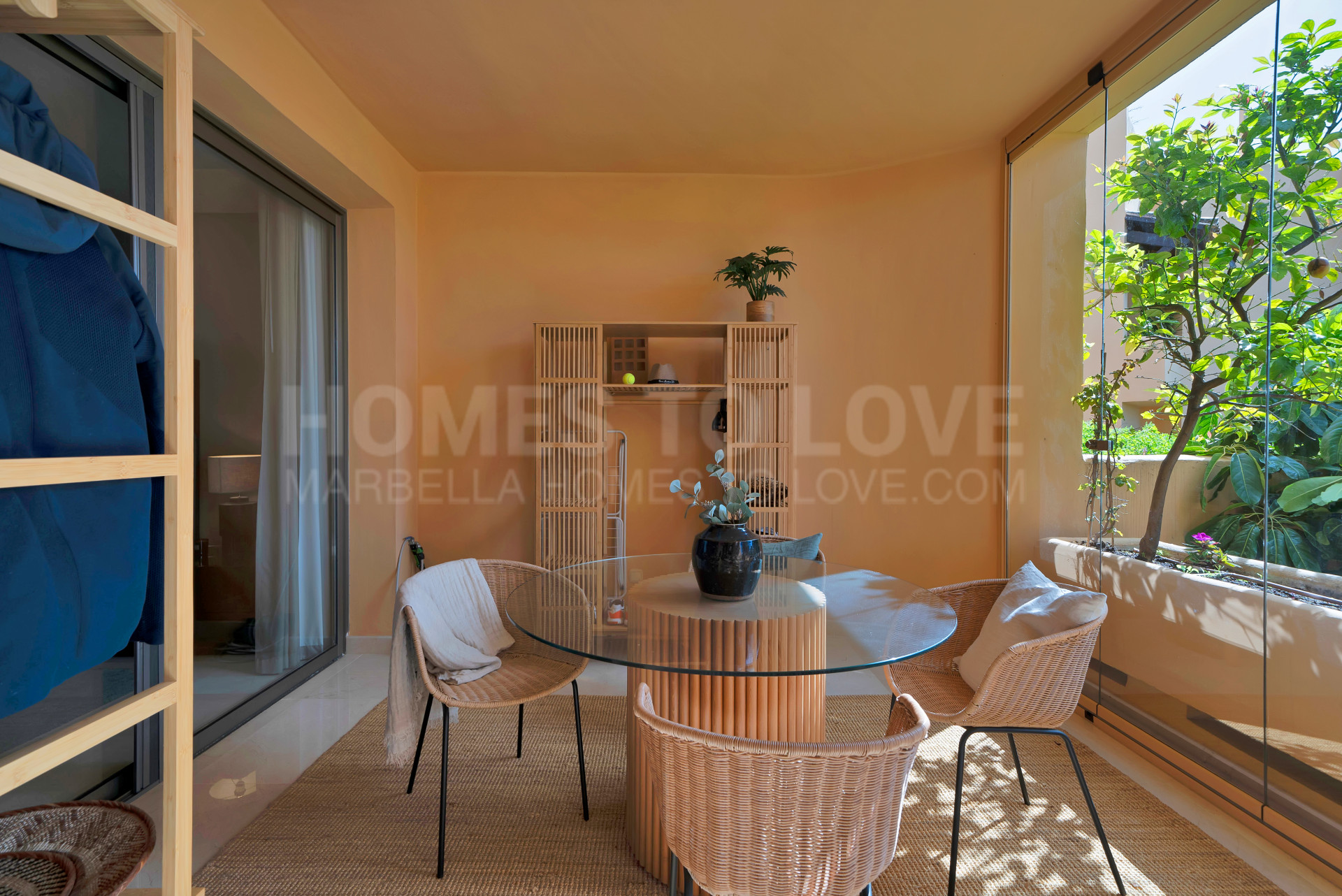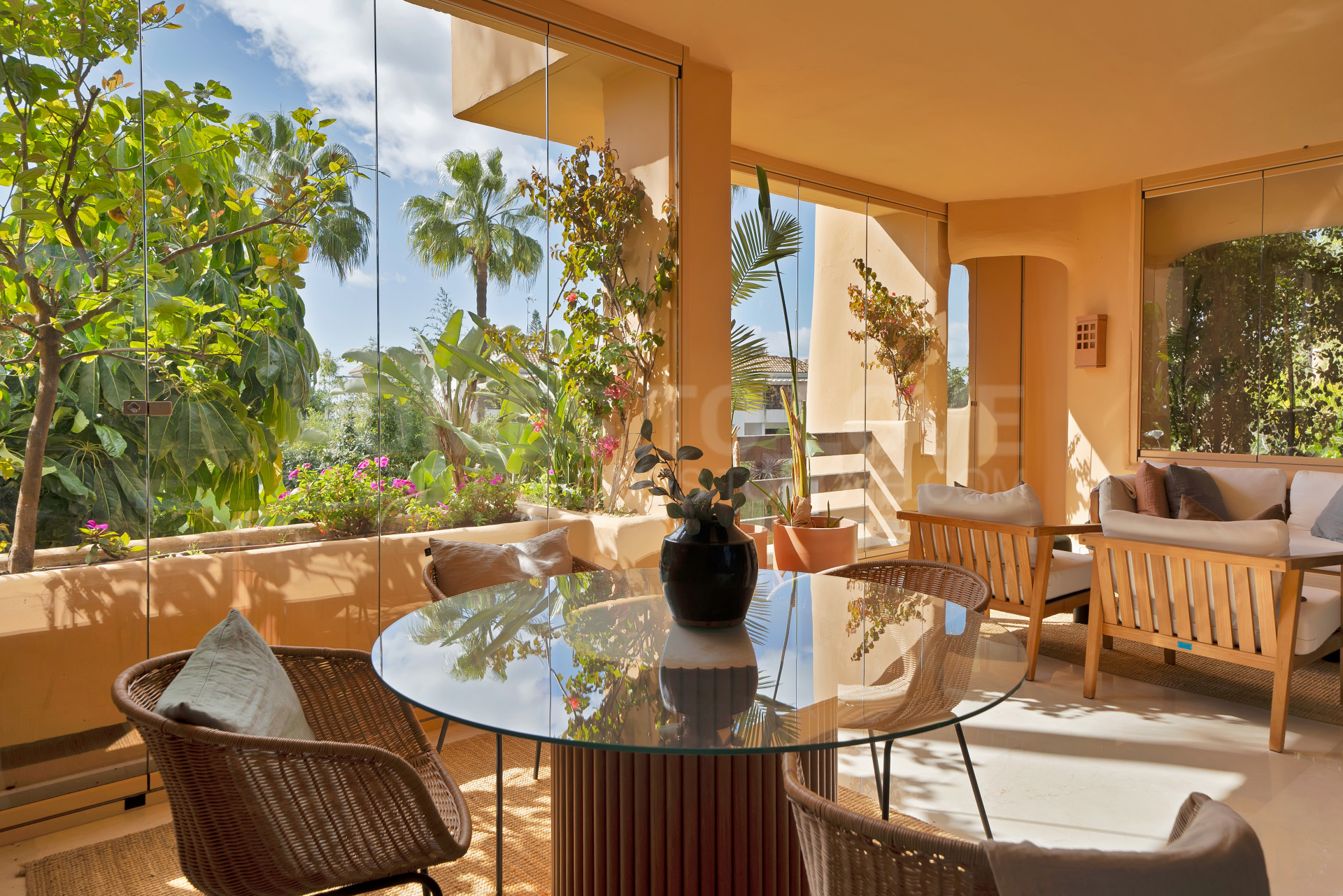 The apartment features a sleek, contemporary design with a newly installed kitchen, custom-built wardrobes, and an advanced air conditioning system for maximum comfort. The open-plan layout includes a welcoming hallway, a spacious living and dining area, a fully equipped kitchen, a master bedroom with an en-suite bathroom, and a guest bedroom with access to a private terrace. Both bedrooms offer ample space and privacy. The property’s 41 m² south-facing terrace is a standout feature, providing a relaxing outdoor space with partial views of the sea and the beautifully landscaped gardens, enclosed with glass for year-round enjoyment. Underfloor heating ensures that the apartment remains cozy during cooler months.