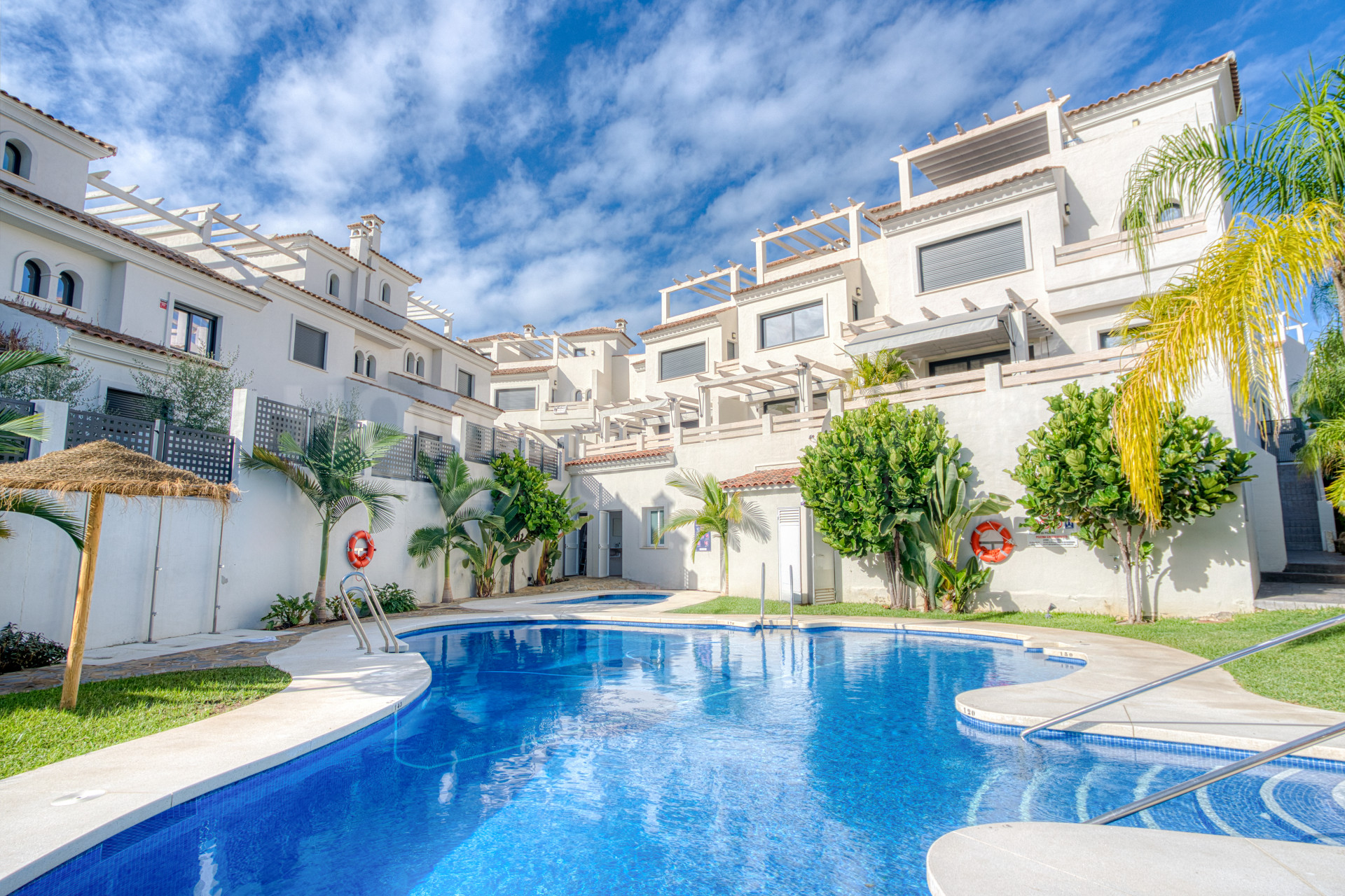 Элегантный трехкомнатный таунхаус, расположенный в закрытом общежитии Agra Residencial, очаровательный комплекс в средиземноморском стиле из 47 просторных домов, расположенный рядом с El Campanario Golf & Country Club, в самом сердце престижного Золотого треугольника Эстепоны. Готовый к переезду, эта недвижимость демонстрирует яркие, открытые интерьеры с качественной отделкой, включая керамические напольные покрытия, оснащенные шкафы, современные ванные комнаты со стеклянными душевыми экранами и полностью меблированную кухню. Предназначенный для комфортного проживания, он имеет щедрые террасы, частный солярий и частный бассейн – идеально подходит для наслаждения жизнью Коста-дель-Соль. Дополнительные моменты включают в себя горячее и холодное кондиционирование воздуха, два подземных парковочных места и доступ к красиво озелененным коммунальным садам и бассейну в этом безопасном закрытом сообществе.